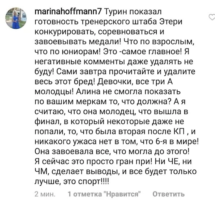 «Турин показал готовность тренерского штаба Этери конкурировать, соревноваться и завоевывать медали! Что по взрослым, что по юниорам! Это самое главное! Я негативные комменты даже удалять не буду! Сами завтра прочитайте и удалите весь этот бред!