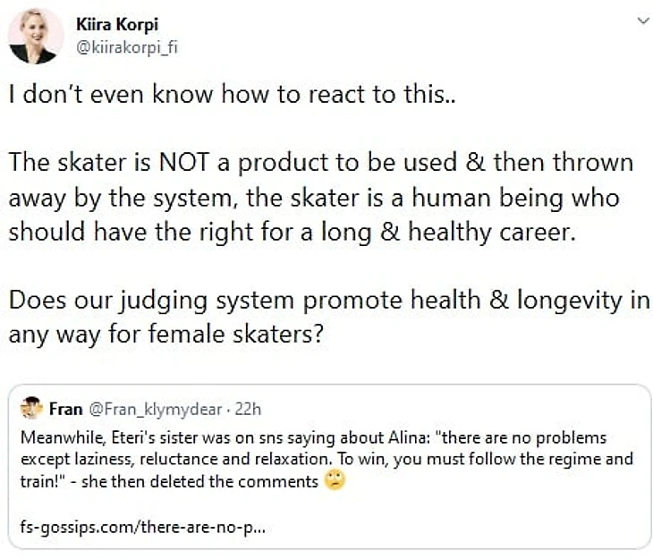 Корпи ответила на твит, в котором утверждалось, что слова Хоффман касались олимпийской чемпионки Алины Загитовой. Но на самом деле сестра тренера не называла фамилий.