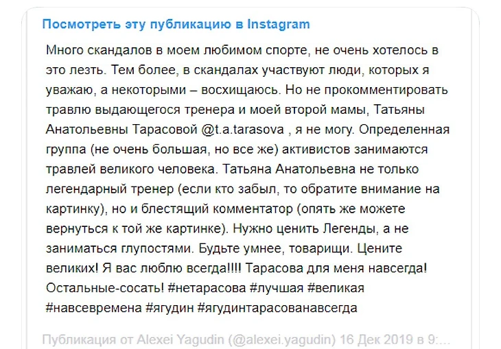 Алексей Ягудин: «Цените великих! Тарасова для меня навсегда! Остальные – сосать!» Позже он убрал последнюю фразу из поста