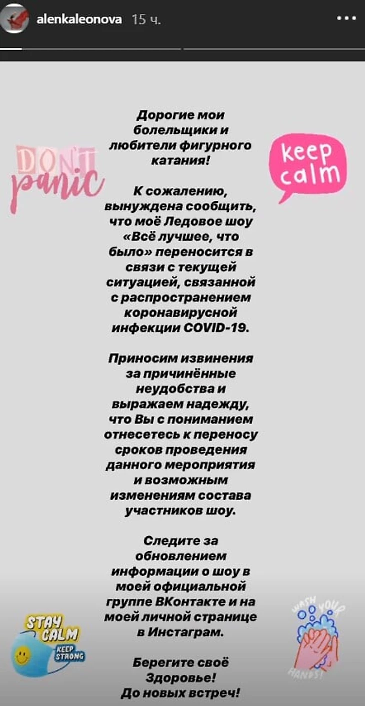 «Дорогие мои болельщики и любители фигурного катания! К сожалению, вынуждена сообщить, что мое ледовое шоу переносится в связи с текущей ситуацией, связанной с распространением коронавирусной инфекции COVID-19.
