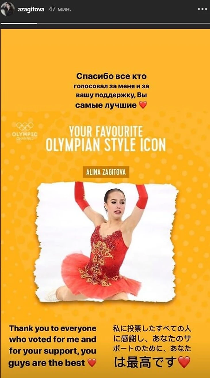 «Спасибо всем, кто голосовал за меня и за вашу поддержку, вы самые лучшие», – написала фигуристка в инстаграме.