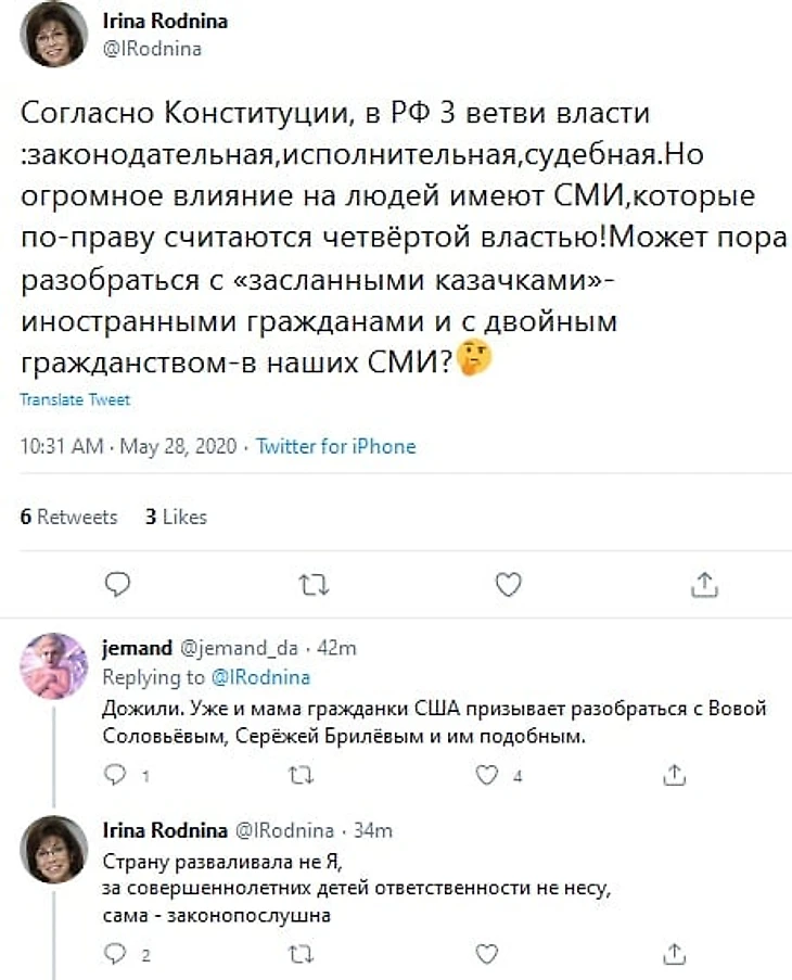 Но огромное влияние на людей имеют СМИ, которые по праву считаются четвертой властью! Может, пора разобраться с «засланными казачками»-иностранными гражданами и с двойным гражданством в наших СМИ?» – написала Роднина в твиттере.