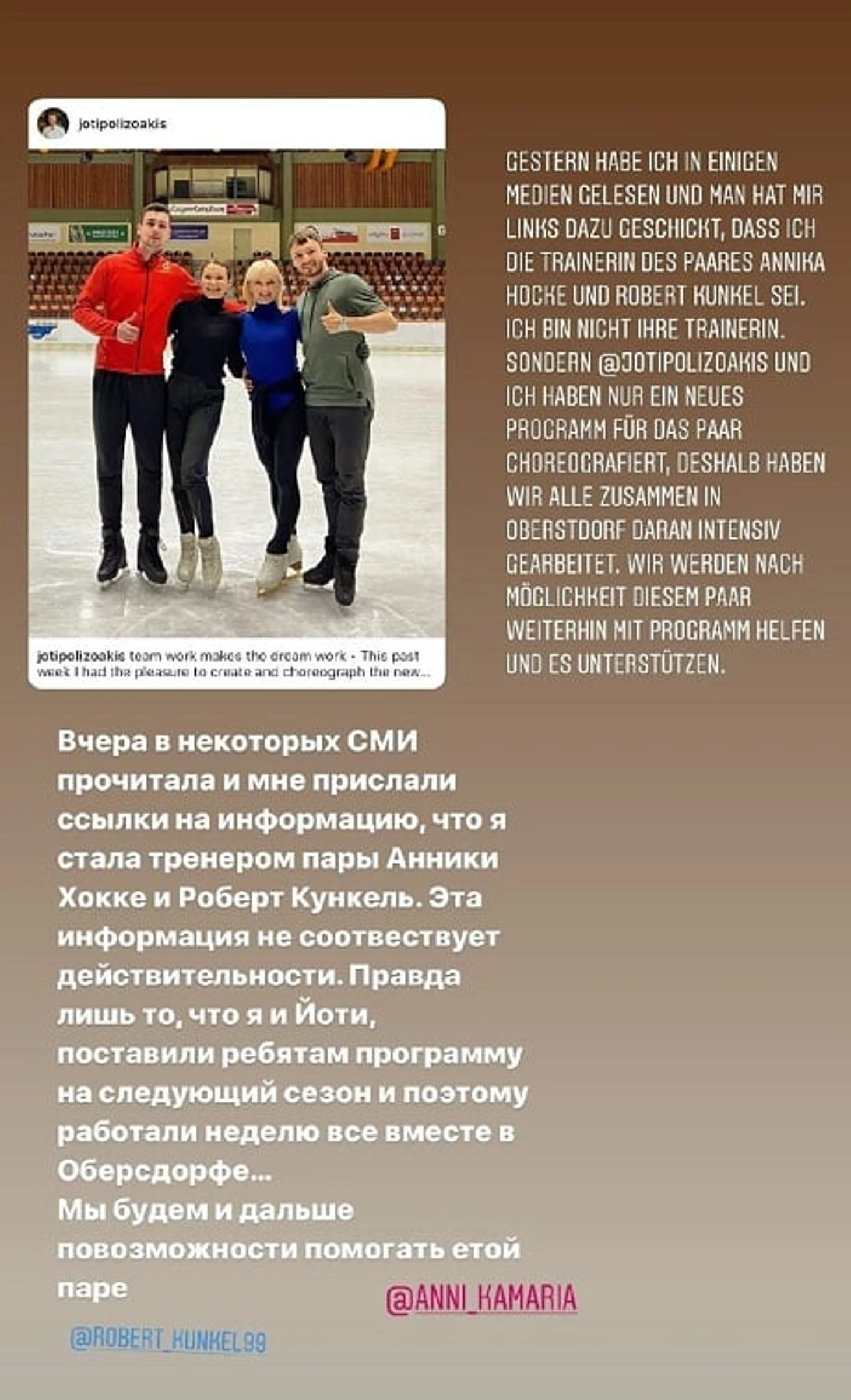 «Вчера в некоторых СМИ прочитала, и мне прислали ссылки на информацию, что я стала тренером Анники Хокке и Роберта Кункеля. Эта информация не соответствует действительности.