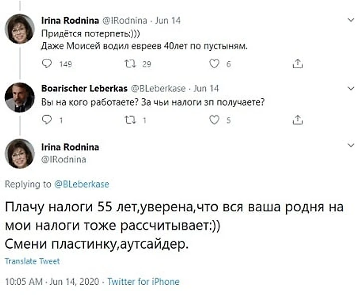 Ирина Роднина – пользователю твиттера: «Плачу налоги 55 лет. Уверена, что вся ваша родня на мои налоги тоже рассчитывает»