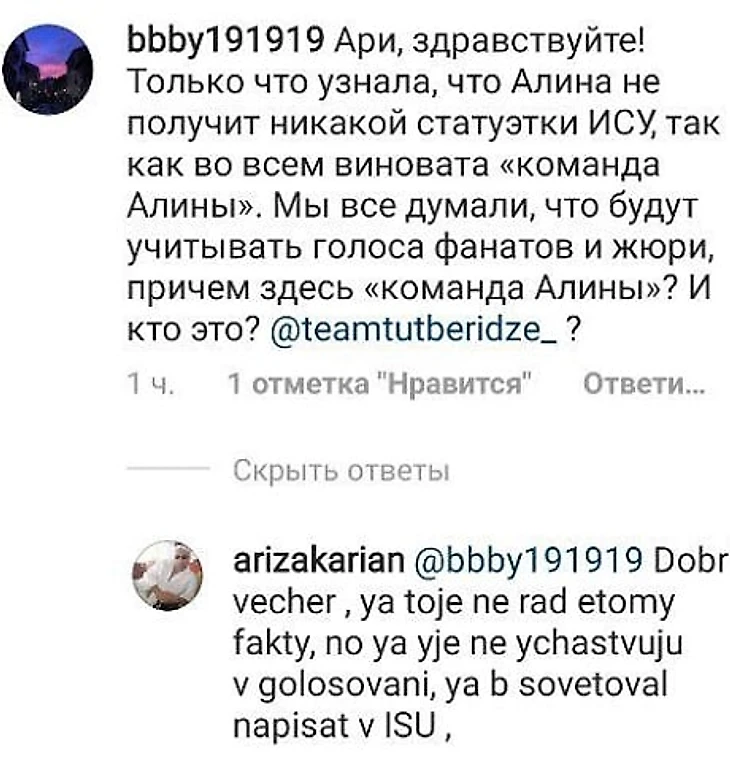 Одна из пользователей инстаграма спросила Закаряна по поводу премии: «Только что узнала, что Алина не получит никакой статуэтки ISU, так как во всем виновата «команда Алины». Мы все думали, что будут учитывать голоса фанатов и жюри, причем здесь «команда Алины»? И кто это?»