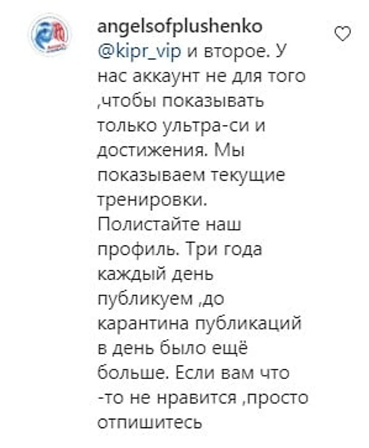 Три года каждый день публикуем, до карантина публикаций в день было еще больше. Если вам что-то не нравится, просто отпишитесь», – ответил представитель «Ангелов Плющенко».
