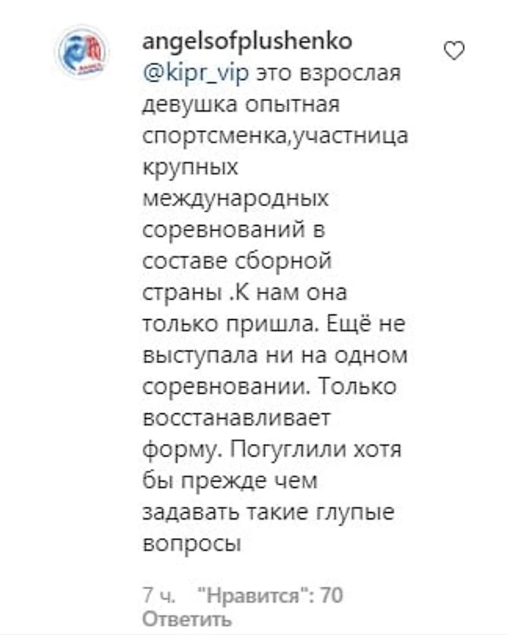 «Это взрослая девушка, опытная спортсменка, участница крупных международных соревнований в составе сборной страны. К нам она только пришла. Еще не выступала ни на одном соревновании. Только восстанавливает форму. Погуглили хотя бы, прежде чем задавать такие глупые вопросы.