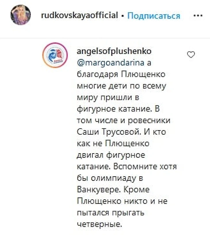Одна из болельщиц написала под записью в инстаграме Яны Рудковской: «Все прыжки Трусовой поставила Этери Тутберидзе! Время рассудит.