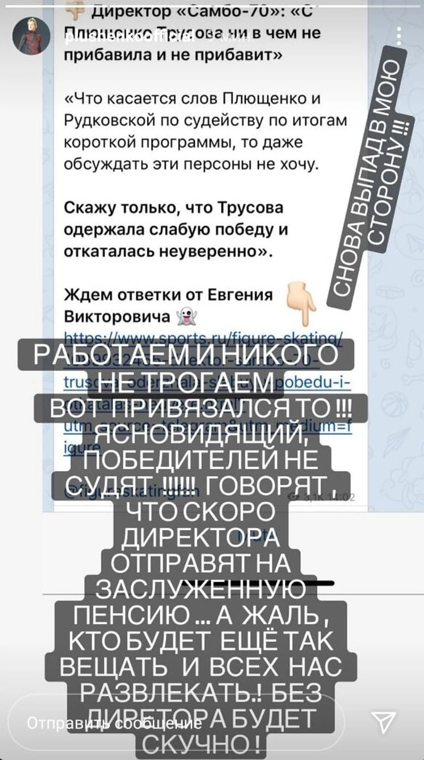 Говорят, что скоро директора отправят на заслуженную пенсию... А жаль, кто будет еще так вещать и всех нас развлекать. Без директора будет скучно!» – написал Плющенко в инстаграме.