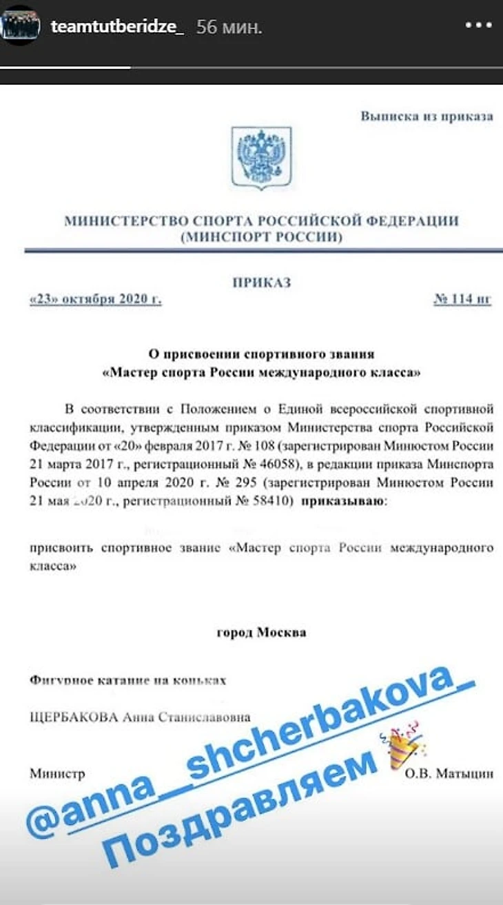 Команда Тутберидзе поздравила Щербакову с присвоением мастера спорта международного класса, замазав на выписке из приказа фамилию Косторной