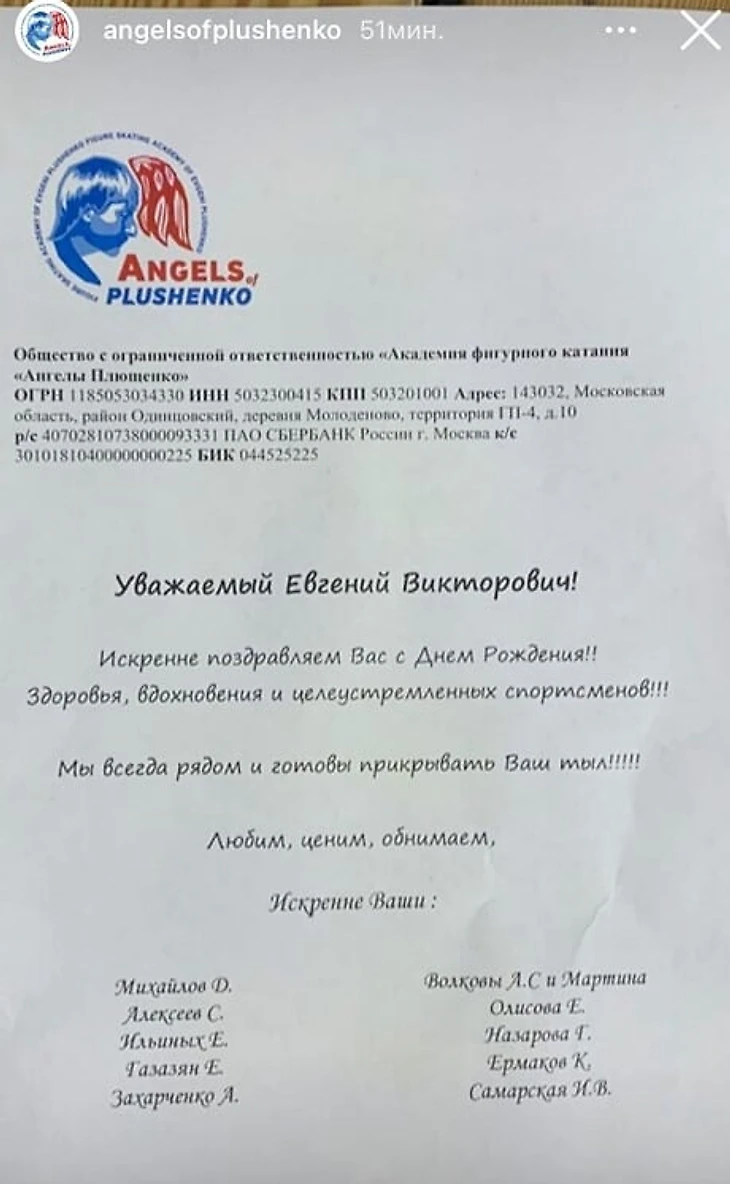 Тренеры «Академии Плющенко» поздравили Евгения с днем рождения. В списке авторов нет Сергея Розанова