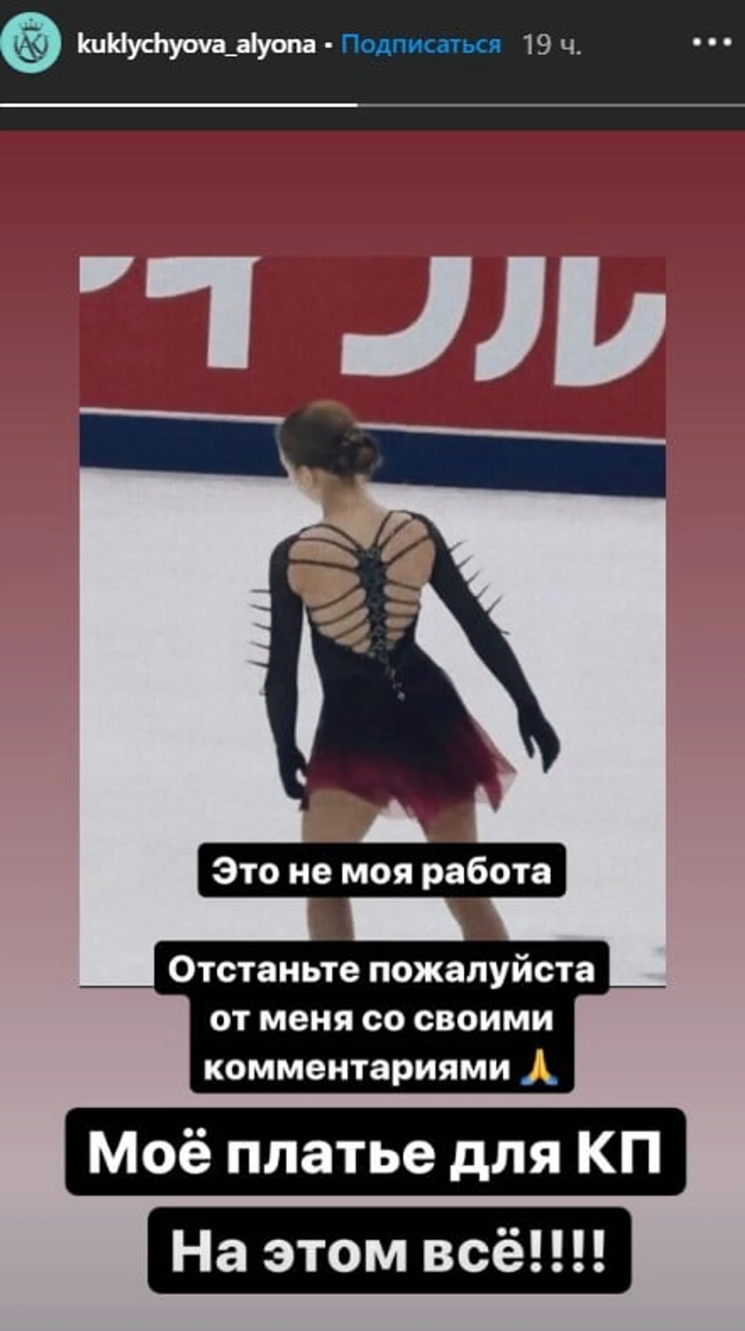 «Это не моя работа. Отстаньте, пожалуйста, от меня со своими комментариями. Мое платье для короткой программы. На этом все!» – написала Куклычева.