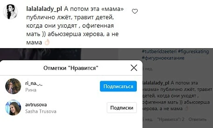 Российская фигуристка Александра Трусова лайкнула комментарий в инстаграме, в котором тренера Этери Тутберидзе назвали «херовой абьюзершой» и написали, что она лжет и травит детей.