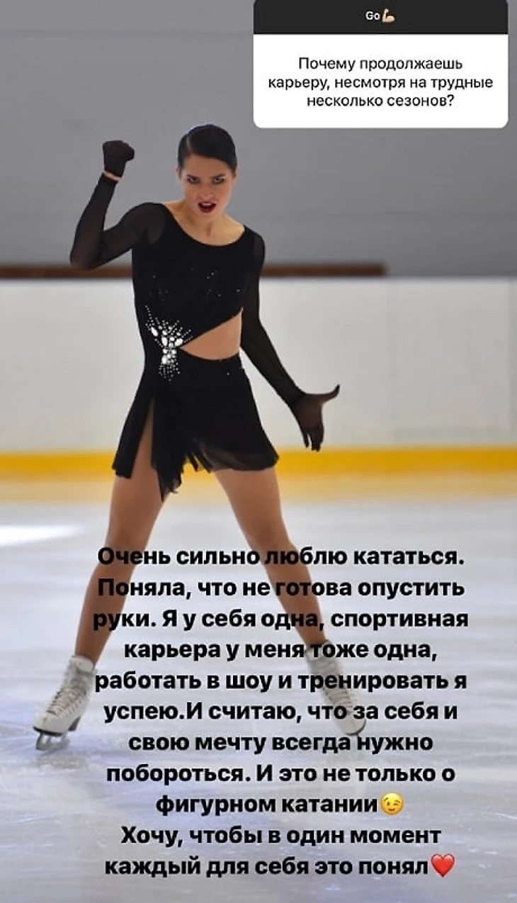 «Очень сильно люблю кататься. Поняла, что не готова опустить руки. Я у себя одна, спортивная карьера у меня тоже одна, работать в шоу и тренировать я успею.