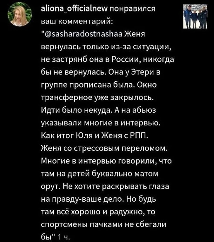 Не хотите раскрывать глаза на правду – ваше дело. Но будь там все хорошо и радужно, то спортсмены пачками не сбегали бы», – говорится в комментарии, который оценила Косторная.