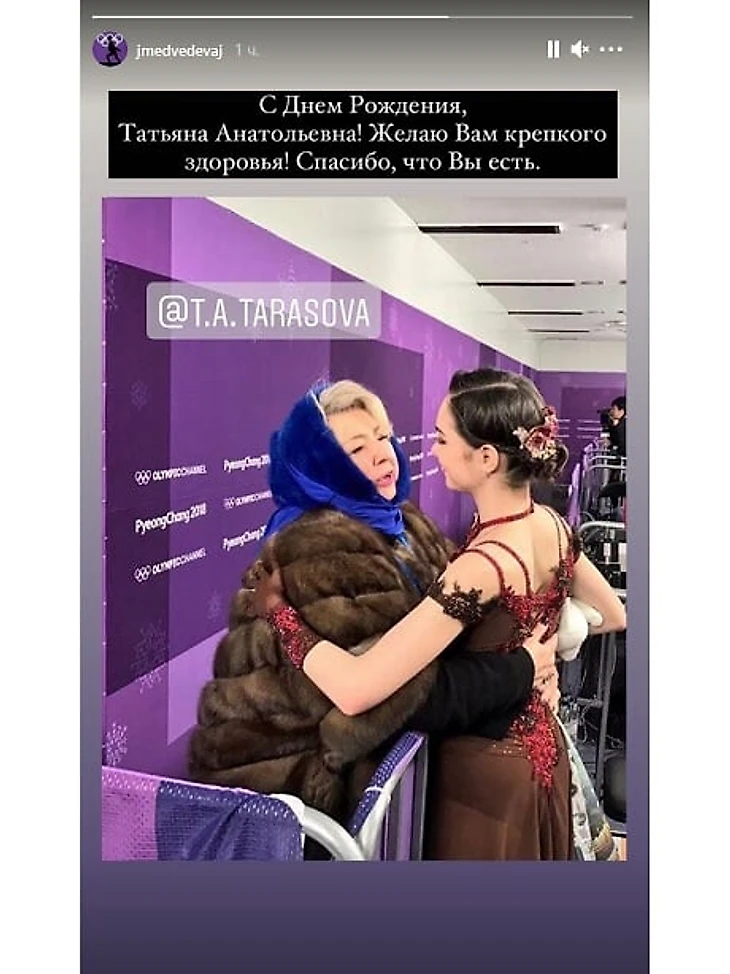 Двукратная чемпионка мира по фигурному катанию Евгения Медведева поздравила заслуженного тренера СССР Татьяну Тарасову с днем рождения.