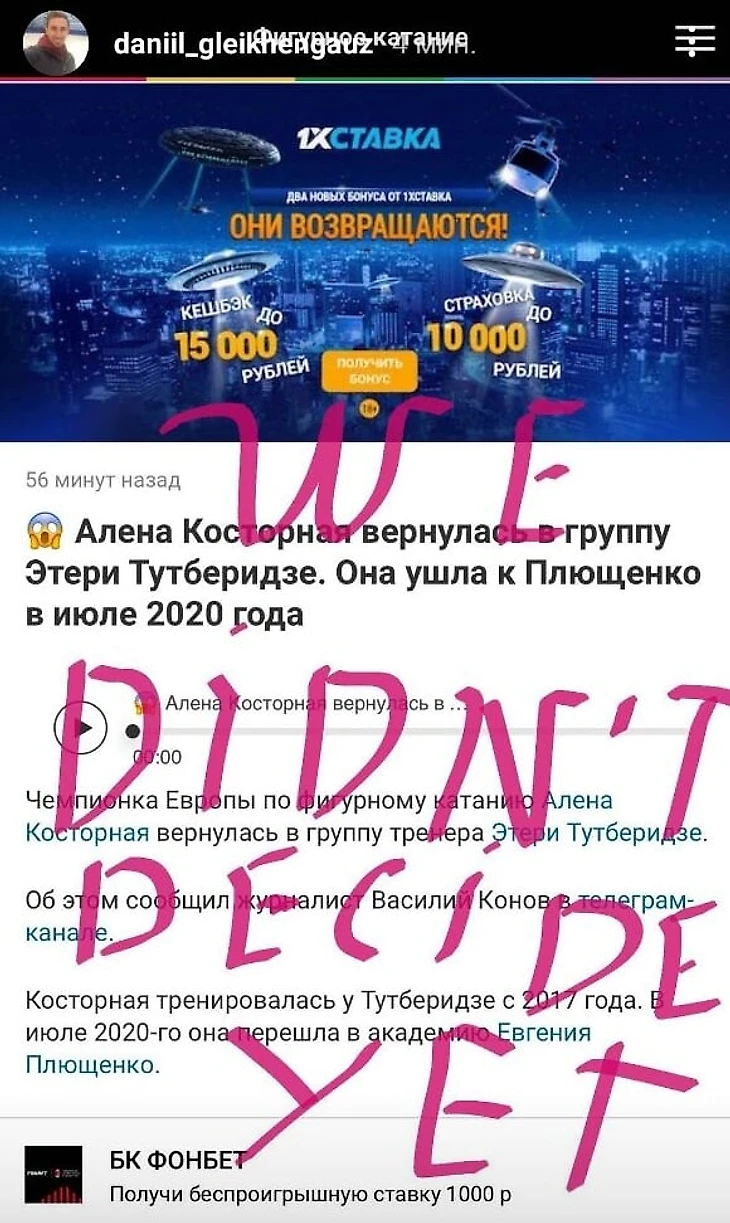 Даниил Глейхенгауз, хореограф группы Этери Тутберидзе, сообщил, что решение о возвращении в группу Алены Косторной еще не принято.