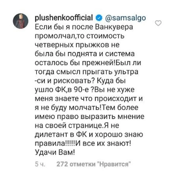 Вы не хуже меня знаете, что происходит и я не буду молчать! Тем более имею право выразить мнение на своей странице. Я не дилетант в фигурном катании и хорошо знаю правила. И все их знают! Удачи вам!» – ответил Плющенко.