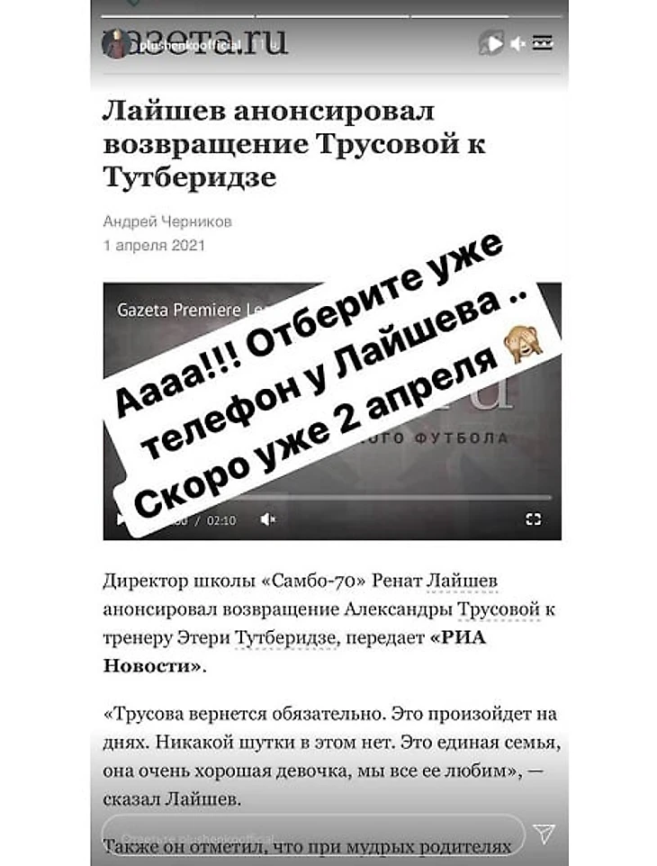 Накануне Лайшев дал несколько интервью, в которых сказал, что Трусова обещала ему вернуться в прежнюю школу. Фигуристка перешла от Тутберидзе в академию Плющенко в мае прошлого года.