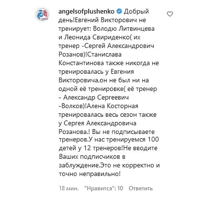 Вы не подписываете тренеров. У нас тренируется 100 детей у 12 тренеров! Не вводите ваших подписчиков в заблуждение. Это некорректно и точно неправильно!» – говорится в комментарии.