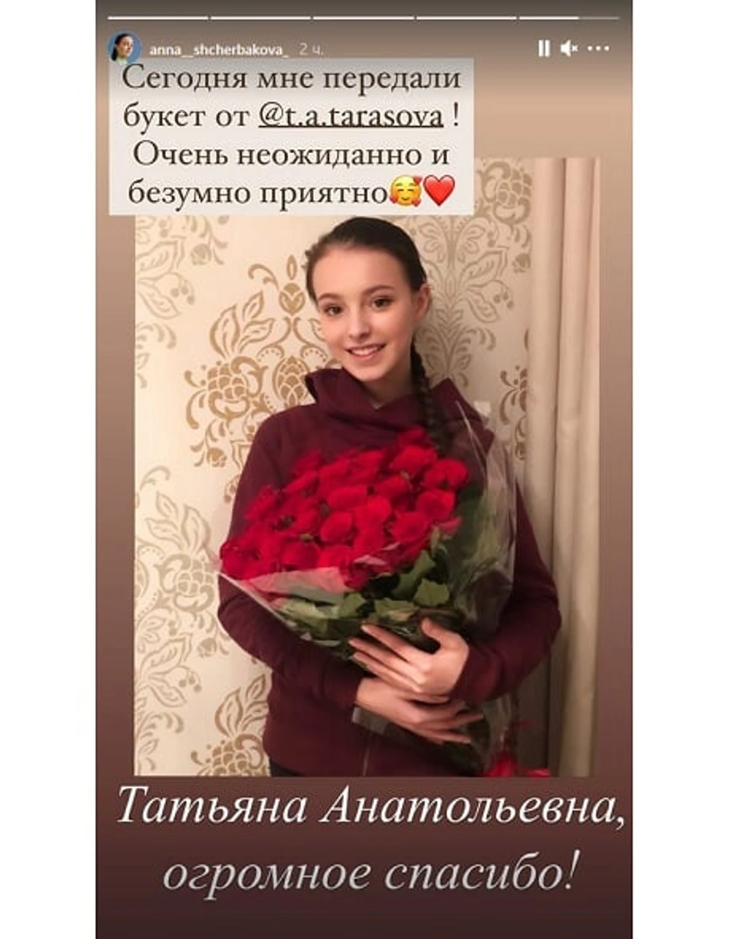 Чемпионка мира по фигурному катанию Анна Щербакова поблагодарила заслуженного тренера СССР Татьяну Тарасову за букет.