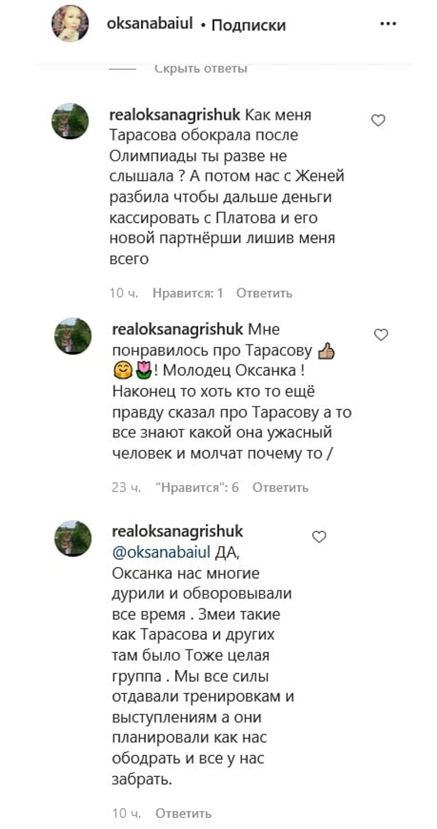 Нас многие дурили и обворовывали все время. Змеи такие, как Тарасова. И других там была тоже целая группа. Мы все силы отдавали тренировкам и выступлениям, а они планировали, как нас ободрать и все у нас забрать», – написала Грищук.