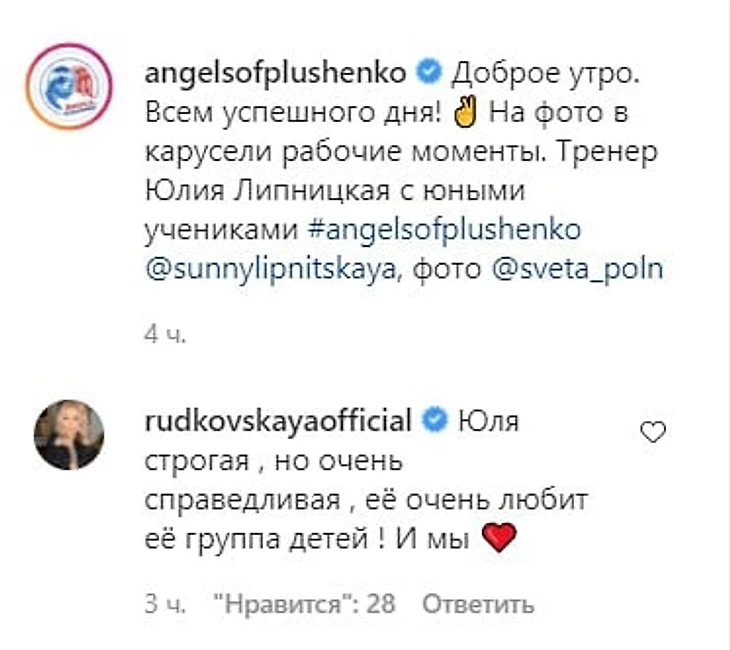 «Юля строгая, но очень справедливая, ее очень любит ее группа детей! И мы», – прокомментировала Рудковская пост с фотографиями занятий Липницкой с учениками.