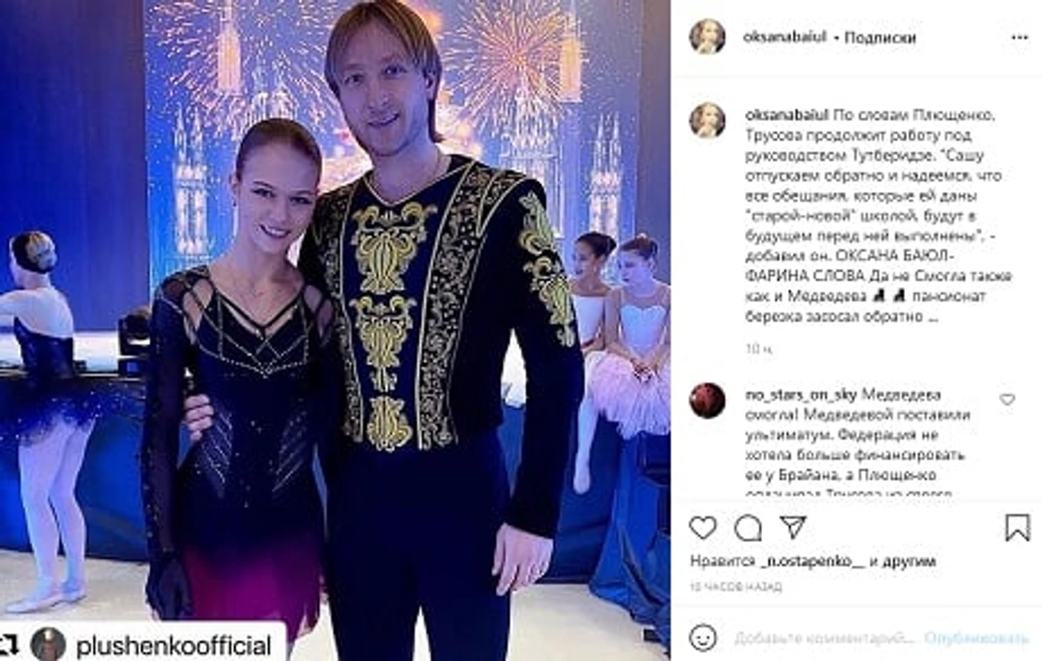 «По словам Плющенко, Трусова продолжит работу под руководством Тутберидзе. «Сашу отпускаем обратно и надеемся, что все обещания, которые ей даны «старой-новой» школой, будут в будущем перед ней выполнены», – добавил он.