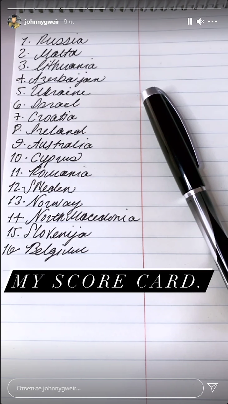 Вейр опубликовал видео в сторис инстаграма. Также он поделился списком своих фаворитов, в котором поставил Россию на первое место.