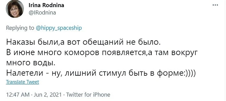 «Наказы были, а вот обещаний не было. В июне много комаров появляется, а там вокруг много воды. Налетели – ну, лишний стимул быть в форме», – ответила Роднина пользователю, написавшему ей: «Если что-то не можешь сделать, то не обещай».