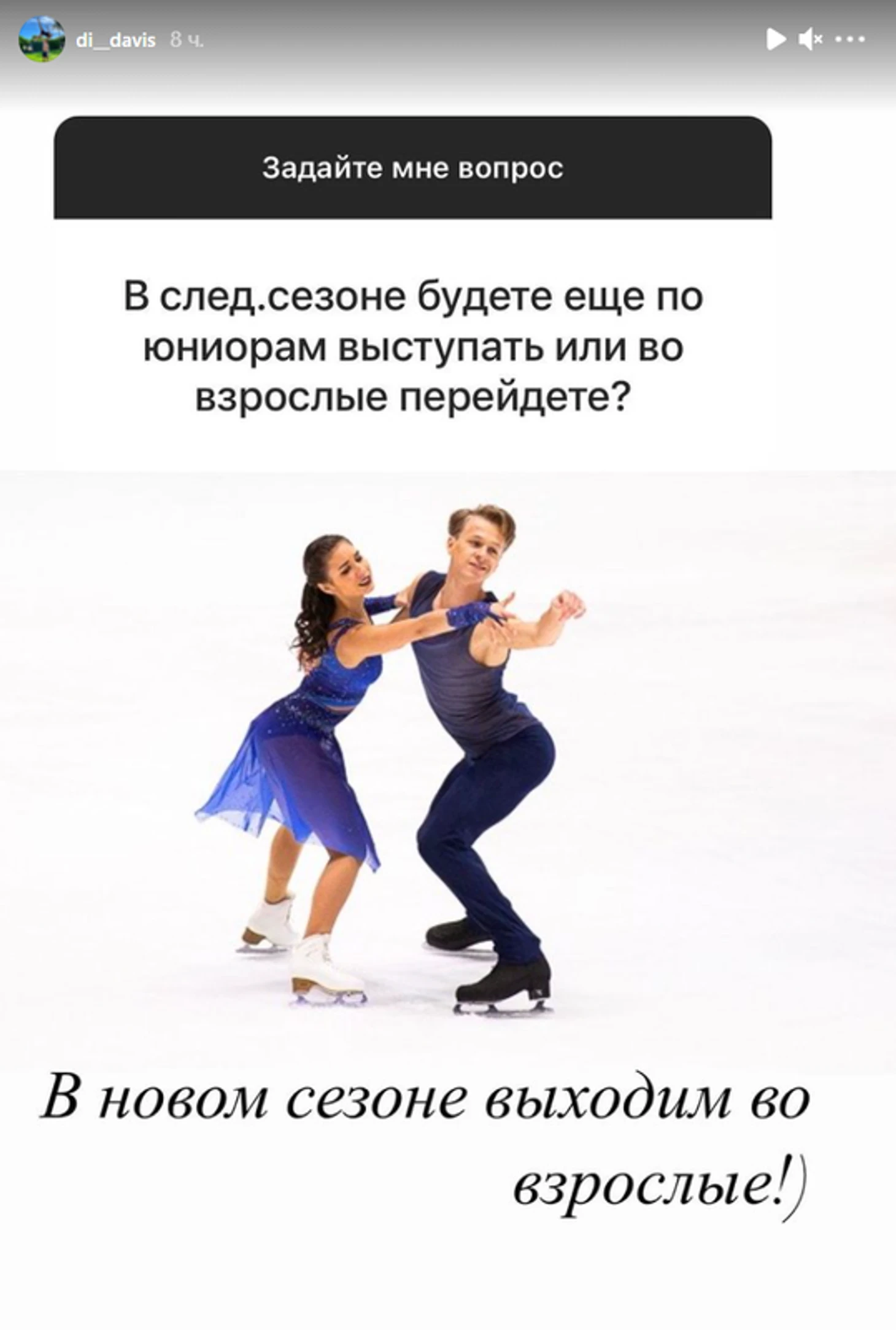 Российская фигуристка Диана Дэвис, выступающая в танцах на льду с Глебом Смолкиным, сообщила, что в новом сезоне дуэт будет выступать во взрослых соревнованиях.