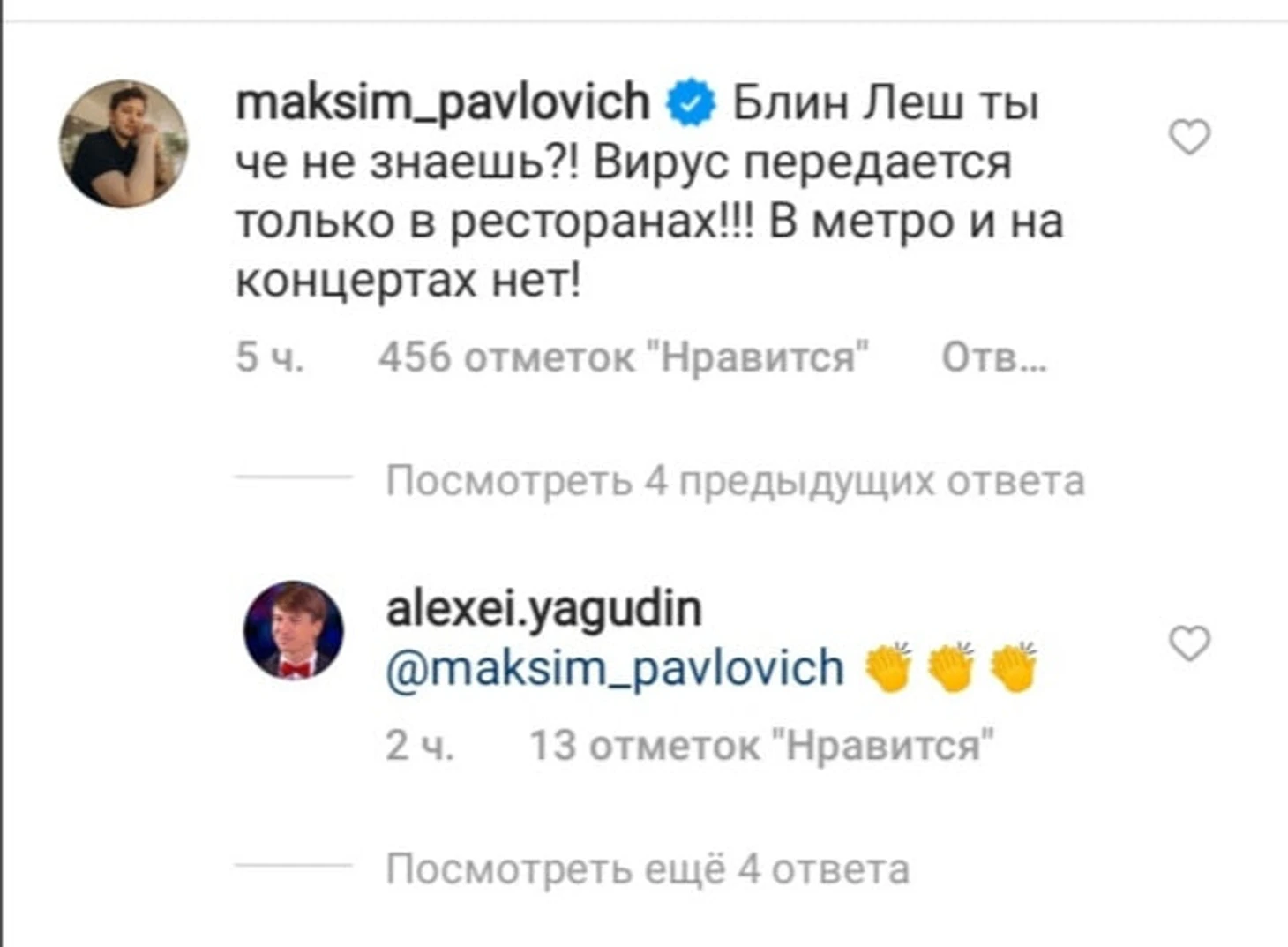 Максим Ковтун – Алексею Ягудину: «Ты че, не знаешь?! Вирус передается только в ресторанах! В метро и на концертах нет!»