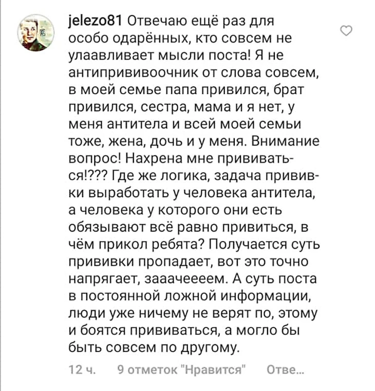 «Отвечаю еще раз для особо одаренных, кто совсем не улавливает мысли поста! Я не антипрививочник от слова совсем, в моей семье папа привился, брат привился, сестра, мама, я – нет, у меня антитела, и у всей моей семьи тоже, жена, дочь.
