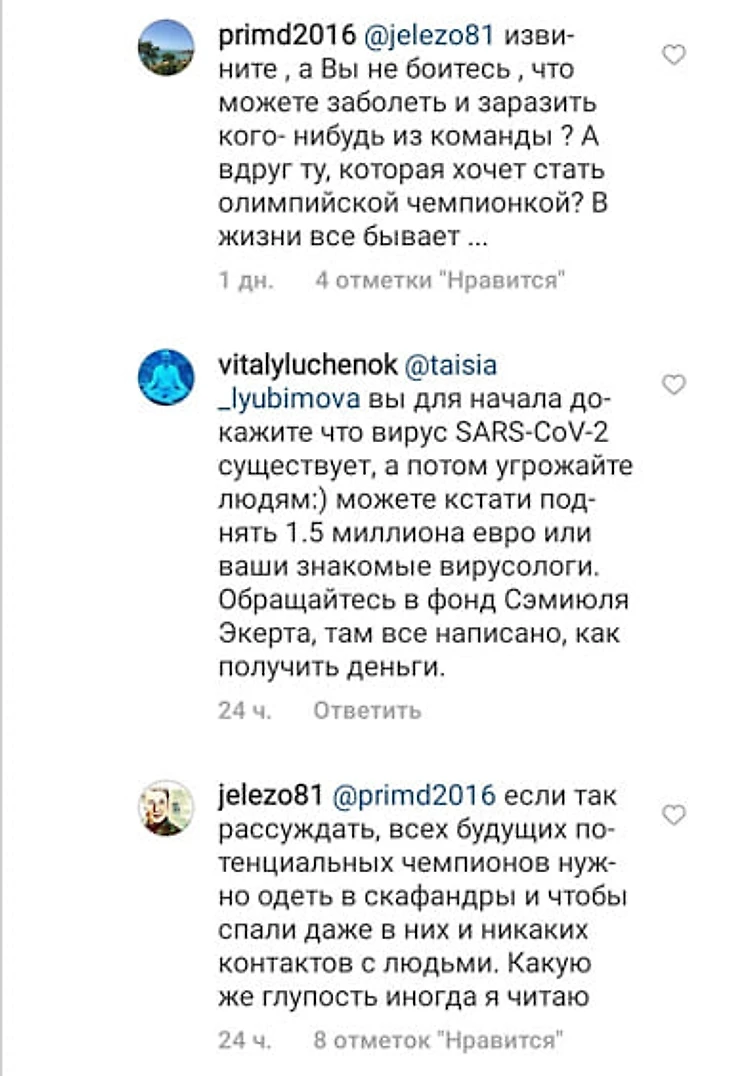«Извините, а вы не боитесь, что можете заболеть и заразить кого-нибудь из команды? А вдруг ту, которая хочет стать олимпийской чемпионкой? В жизни все бывает...», – написал подписчик.