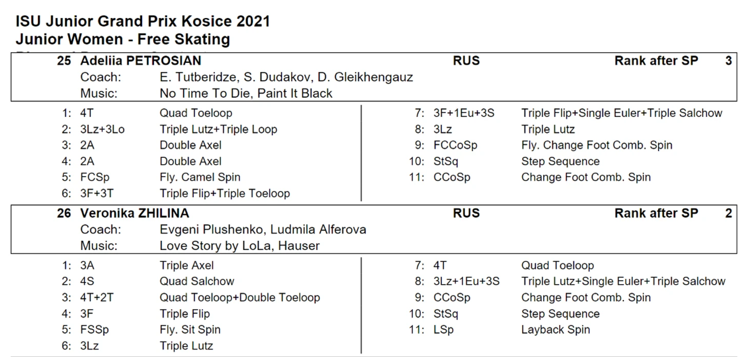 У Вероники Жилиной – тройной аксель и три квада, у Петросян – четверной тулуп: заявки российских фигуристок на произвольную программу этапа в Кошице