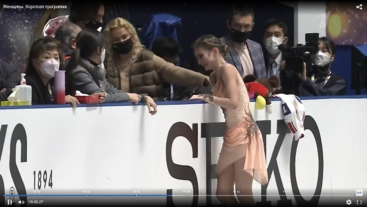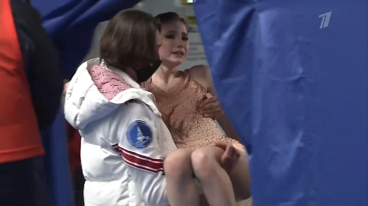 Спортсменка упала при попытке исполнить тройной флип, ее унес на руках врач сборной России Филипп Шветский.