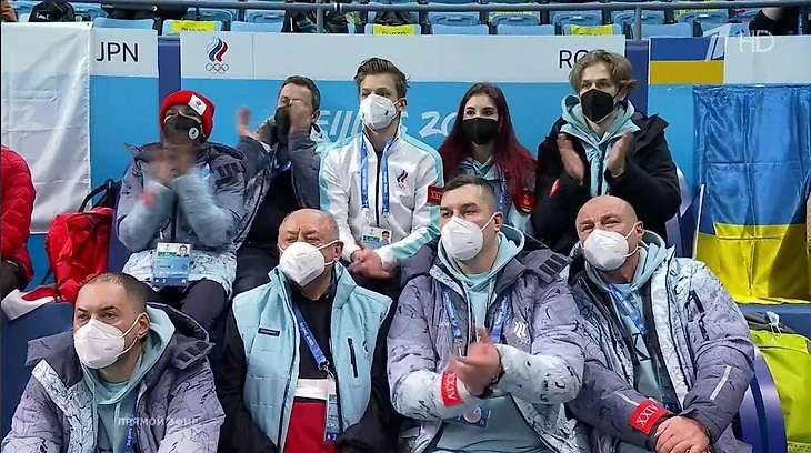 В боксе сборной России находятся фигуристы Камила Валиева, а также Евгений Семененко и Диана Дэвис с Глебом Смолкиным, не заявленные на короткую программу. Сейчас в рамках соревнований проходит мужская короткая программа, где команду представляет Марк Кондратюк.