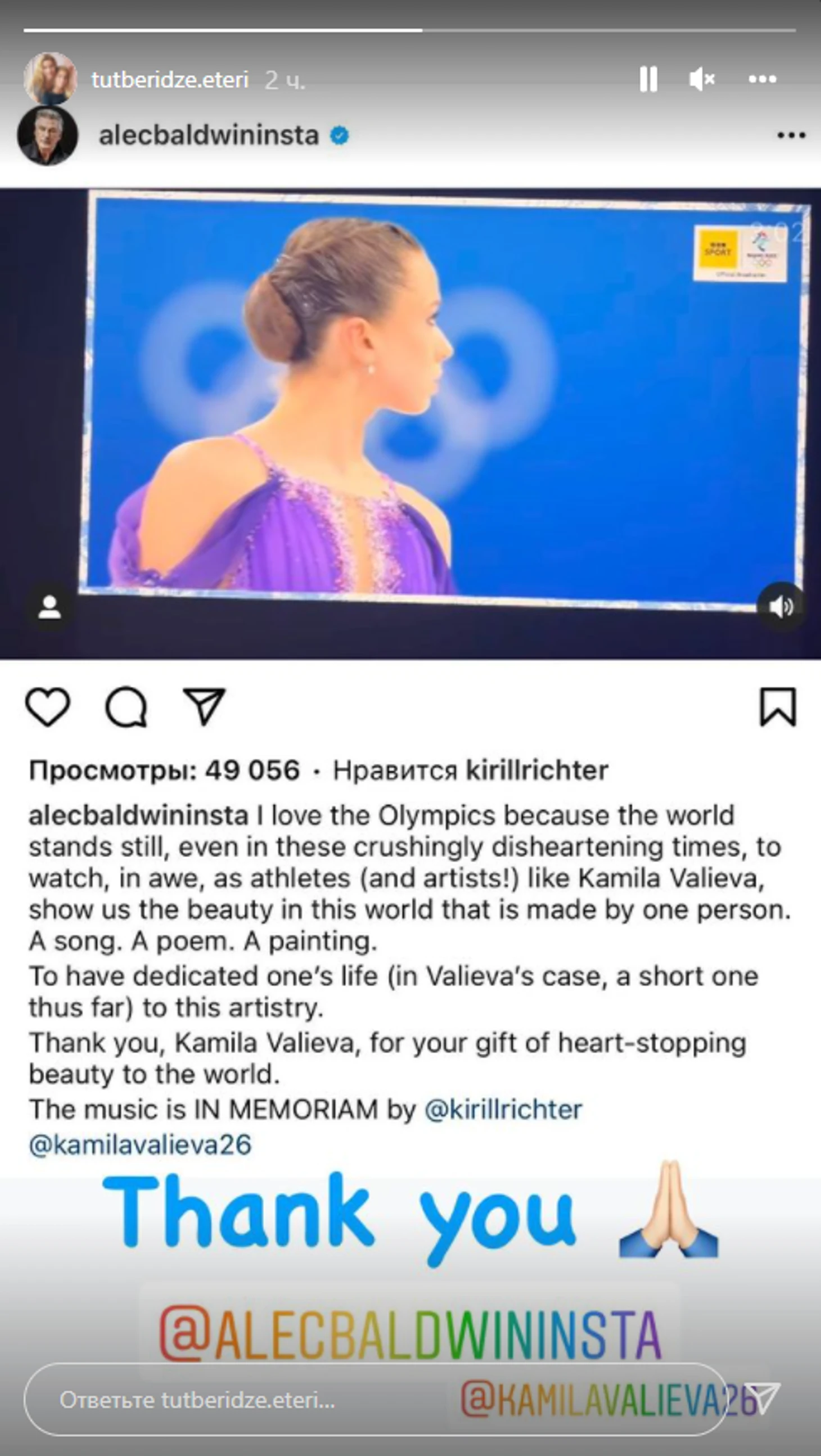 Тутберидзе поблагодарила актера Болдуина за слова в адрес Валиевой. Ранее он сравнил прокат фигуристки с искусством