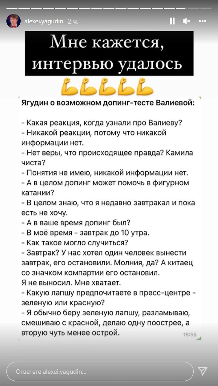 «Мне кажется, интервью удалось 💪», – написал позднее Ягудин в сторис инстаграма.
