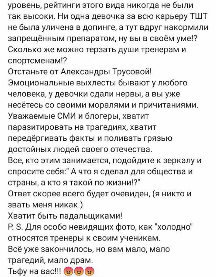 Ни одна девочка за всю карьеру тренерского штаба Тутберидзе не была уличена в допинге, а тут вдруг накормили запрещенным препаратом, ну вы в своем уме!? Сколько можно терзать души тренерам и спортсменам!?