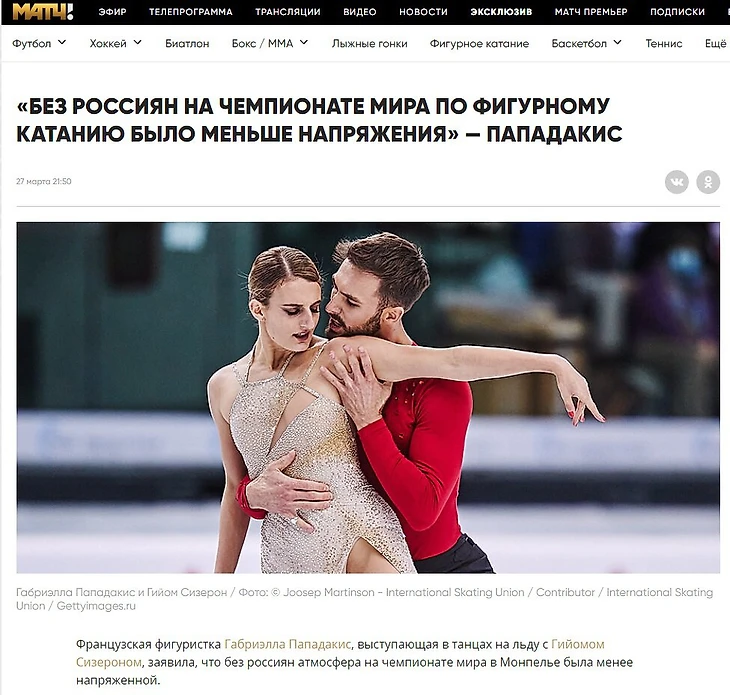 Ранее «Матч ТВ» со ссылкой на RTLSport дал слова партнерши Сизерона – Габриэлы Пападакис (новость все еще на сайте). На самом деле ситуацию с неучастием России прокомментировал партнер – послушать отрывок из подкаста на французском можно здесь (с 23:14).