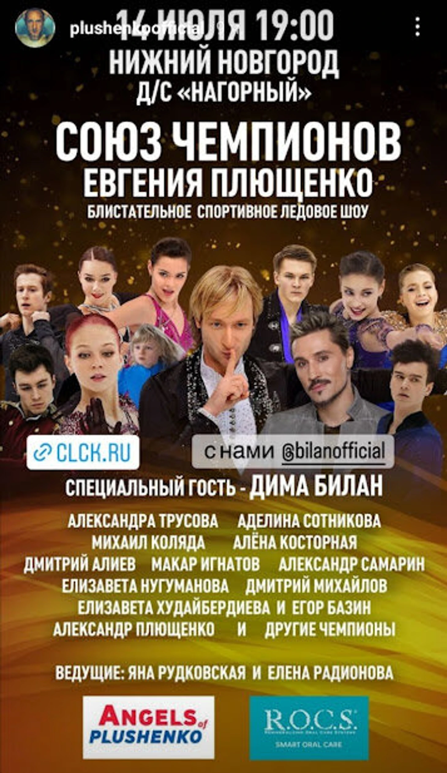 14 июля во Дворце спорта «Нагорный» в Нижнем Новгороде пройдет шоу двукратного олимпийского чемпиона Евгения Плющенко «Союз чемпионов».