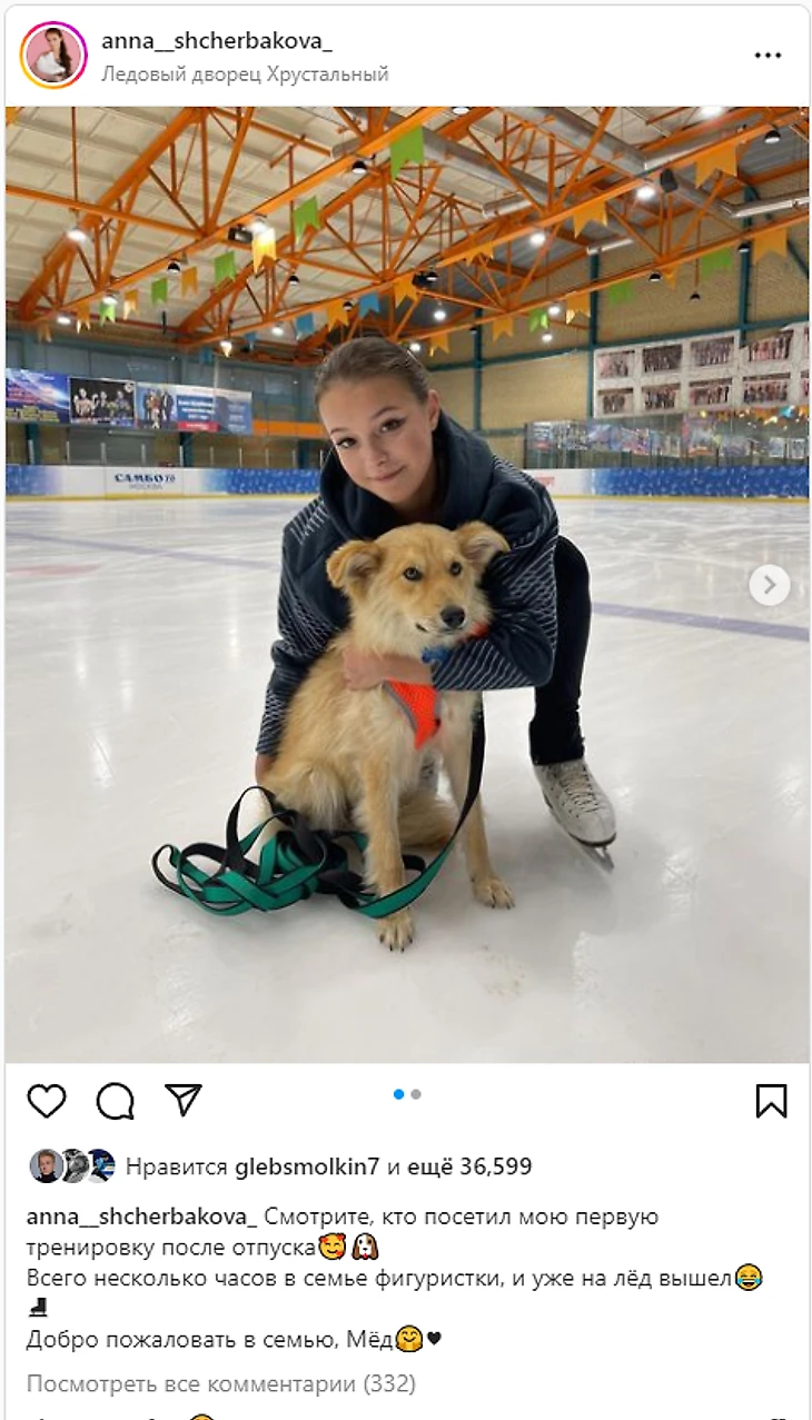 «Всего несколько часов в семье фигуристки, и уже на лед вышел». Щербакова во время тренировки показала свою новую собаку