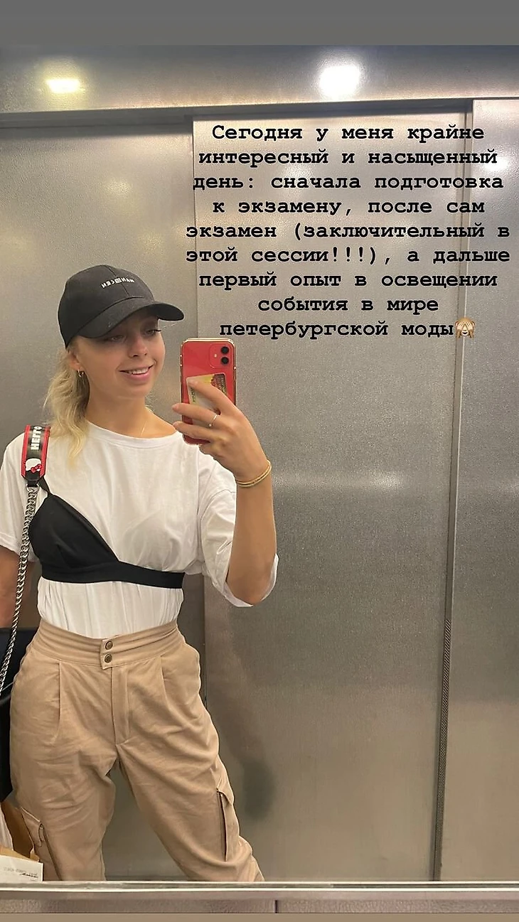 «Сегодня у меня крайне интересный и насыщенный день: сначала подготовка к экзамену, после сам экзамен (заключительный в этой сессии!), а дальше первый опыт в освещении события в мире петербургской моды», – написала Бойкова.