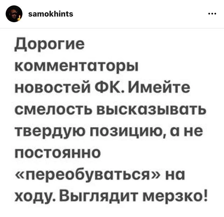 «Дорогие комментаторы новостей фигурного катания. Имейте смелость высказывать твердую позицию, а не переобуваться на ходу. Выглядит мерзко!» – написал Самохин.