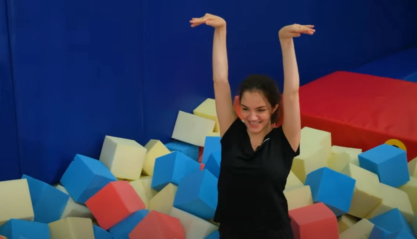 Затем они отправились в зал, где гимнаст объяснял фигуристке, как делать сальто назад – Медведева исполняла элемент впервые и приземлилась на мягкие кубики.
