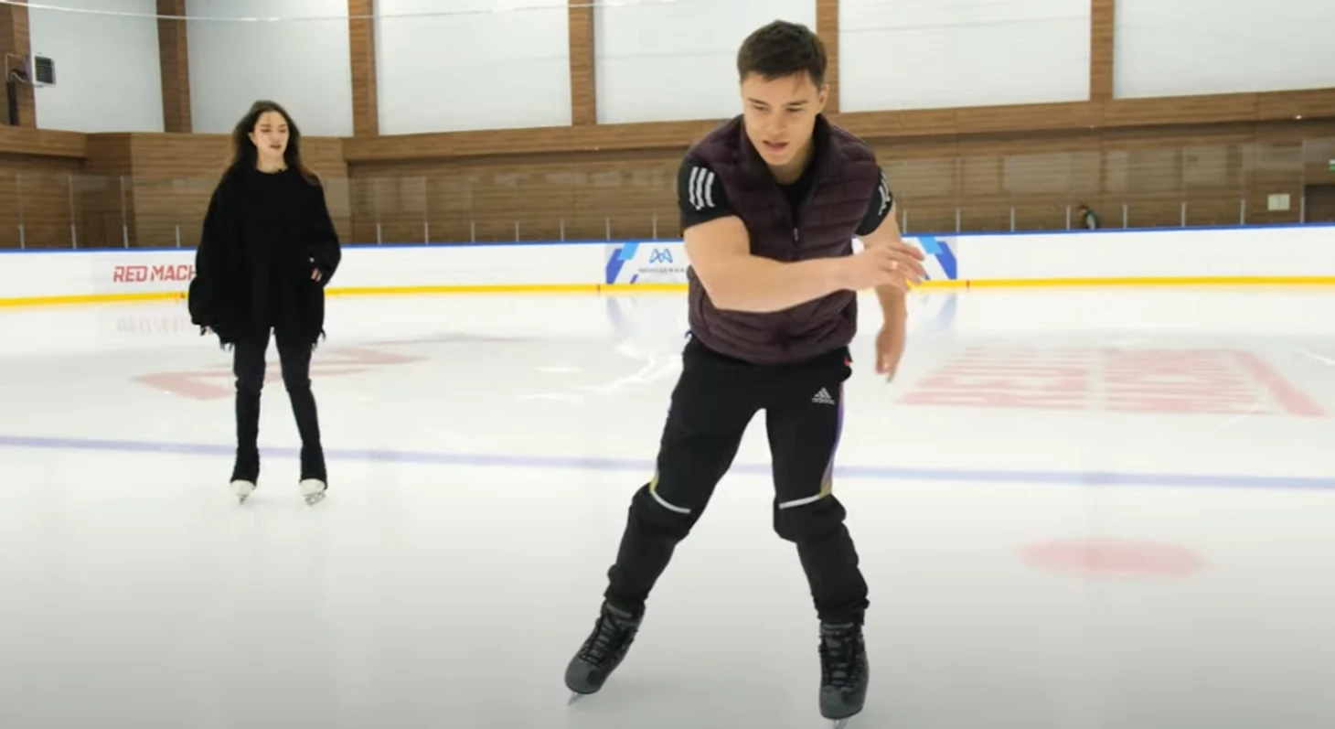 Сначала спортсмены вышли на лед, где Медведева учила Нагорного делать вращение, тулуп и кораблик.