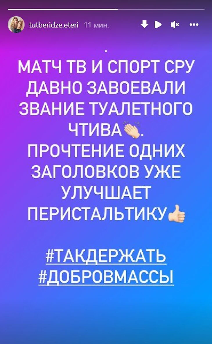 Этери Тутберидзе: «Матч ТВ» и Спорт Сру давно завоевали звание туалетного чтива. Прочтение одних заголовков улучшает перистальтику»