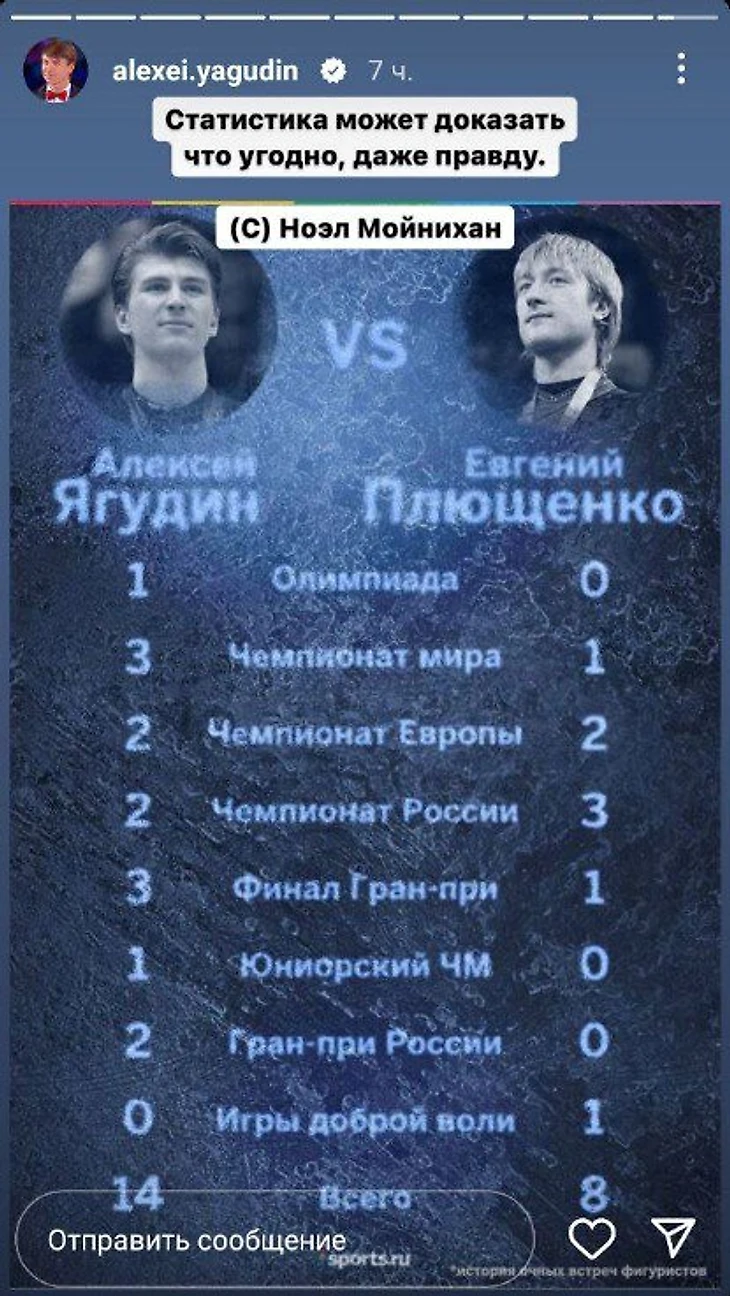 Ягудин в ответ Плющенко опубликовал картинку Sports.ru с их личными встречами: «Статистика может доказать что угодно, даже правду»