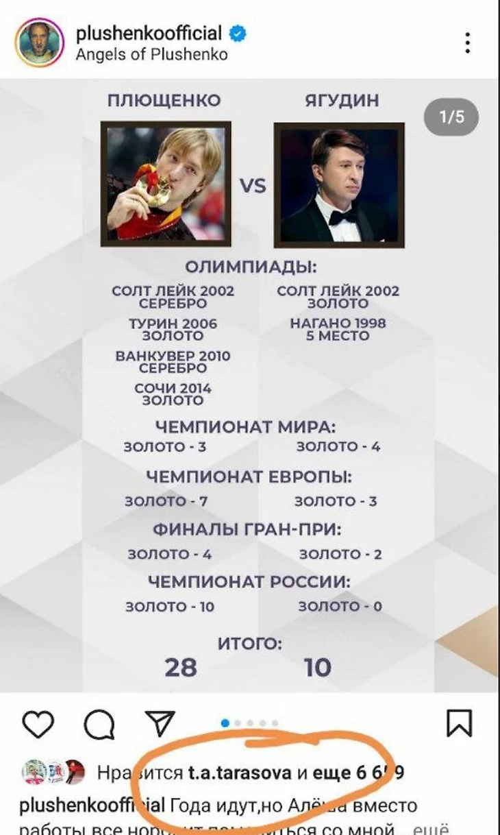 Татьяна Тарасова лайкнула пост Плющенко, в котором он раскритиковал Ягудина